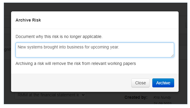 A pop up will appear for you to document why this risk is no longer applicable. Enter in your description and then you can select Archive;