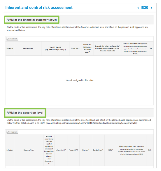We now have the B30 workpaper (Inherent and control risk assessment), which is where we create our risks and assign them to the relevant tables (RMM at the financial statement level table or RMM at assertion level table)