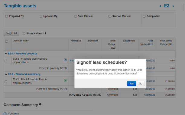 To use this feature the user will automatically be prompted, when signing off a Lead Schedule Summary at any stage of the engagement, to select yes or no to the question: