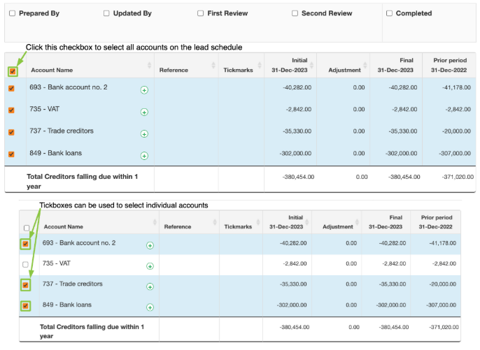 If you have a supporting document, comment, or tick mark which applies to more than one account in your Lead Schedule then you can benefit from the multiple account selector in MyWorkpapers, allowing you to upload multiple supporting documents or create bulk annotations in a single action.