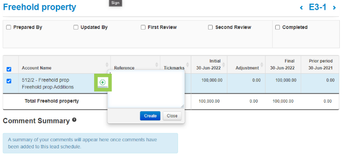 - A summary of comments will appear at the bottom of Lead Schedule Summary or Lead Schedule;