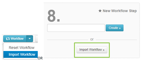 - Select the Import Workflow button from the Workflow drop down menu or from underneath the New Workflow Step
