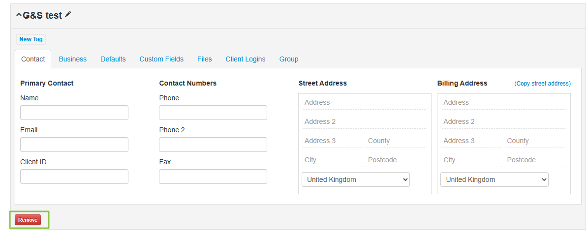 Note: If you cannot see a red remove button, this will be due to File(s) being assigned to the client. These will need to either be deleted or re-allocated to another client. You can locate the files by clicking the "Files" tab within the client section. Please see below for links to deleting files and re-allocating files.